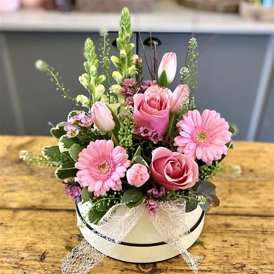 Our Mother's Day hatbox arrangement is pretty and bright to show Mum just how much you care. Gorgeous pink roses, pretty germini, spring tulips, waxflower and snapdragons.