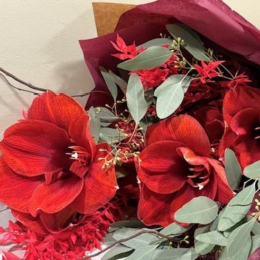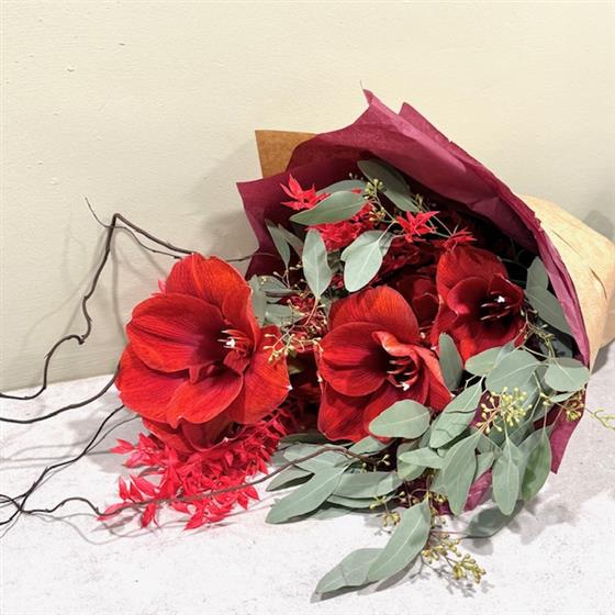 Velvet Focal Blooms: Large, trumpet-shaped Red Amaryllis serve as the "heart" of the bouquet. Their bold presence makes a statement of elegance and passion.