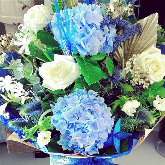 Our Silent Night hand-tied bouquet in Classic Blue is calming and peaceful. A dash of sparkle like a perfect night sky. To reflect a mindful Christmas and let go of a difficult year. This beautiful blue arrangement features big hydrangea, wintery thistle, crisp white roses, nerines and anemonies. Deep blue virburnum berry and blue eucalyptus foliage. Christmas pine and gold touches such as hypericum, decorative feathers and fans. This heavenly bouquet is available in 3 sizes.